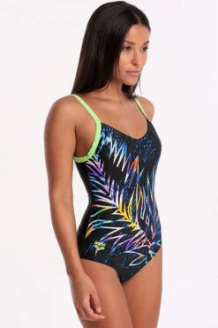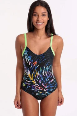 We design premiere swimsuits for racing and training, so we understand comfort and fit. Made for fitness swimming, Our Hoya One-piece has a multicoloured print that really pops against the dark background. It is finished with contrasting straps and a flattering V-neckline.