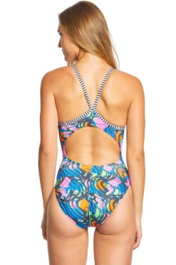 GREAT DETAILS: Practice in style! Our classic one piece V-2 back is the perfect practice swimsuit for comfort and durability during those early morning workouts. While providing a bit more coverage for the back and rear, this suit in the fun and bright party gras print complemented by the classic candy stripe binding is sure to make you shine!
