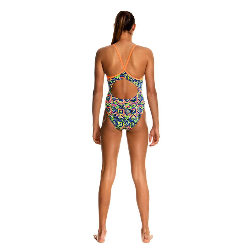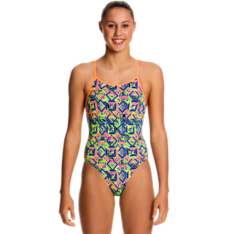 Our classic training style with signature diamond back strap finish and modest rear coverage is perfect for lap sessions. Features a circular cut-out back. With front lining and Funkita embroidery, this easy style says it all. Available in girls’ sizes 8 – 14.