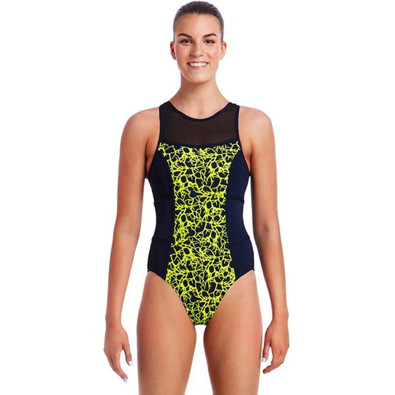 A high back, high neck one piece with a mesh panel across the chest and zip fastening to secure at back. Panelled to create a strong silhouette and lined with powermesh for an extra supportive fit. Moderate rear coverage. Available in sizes 8 – 16.