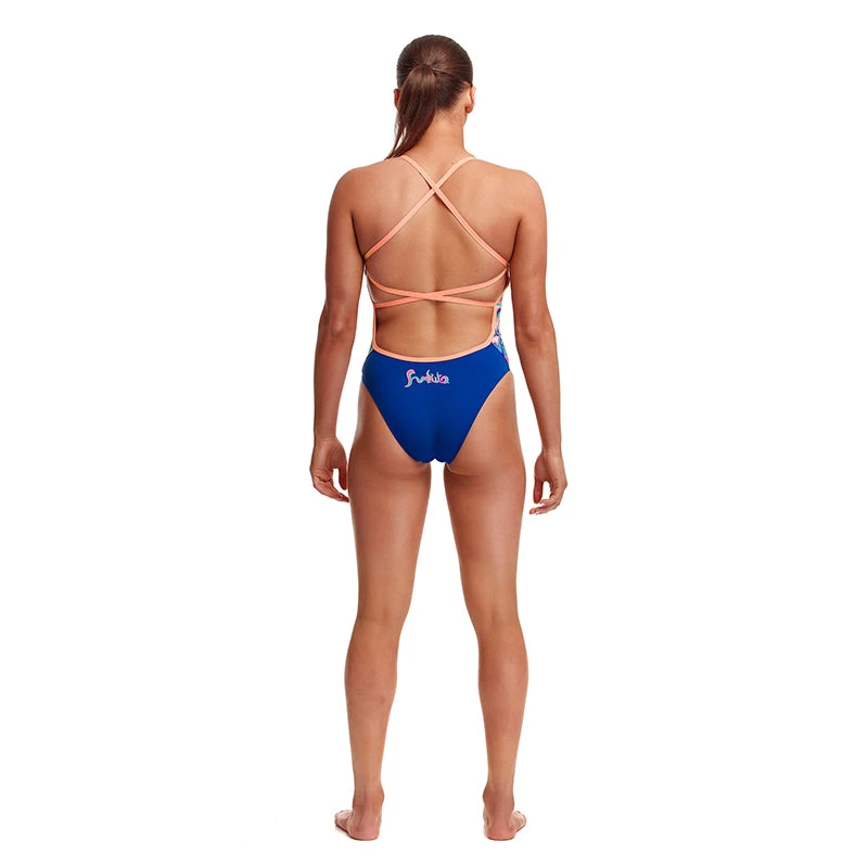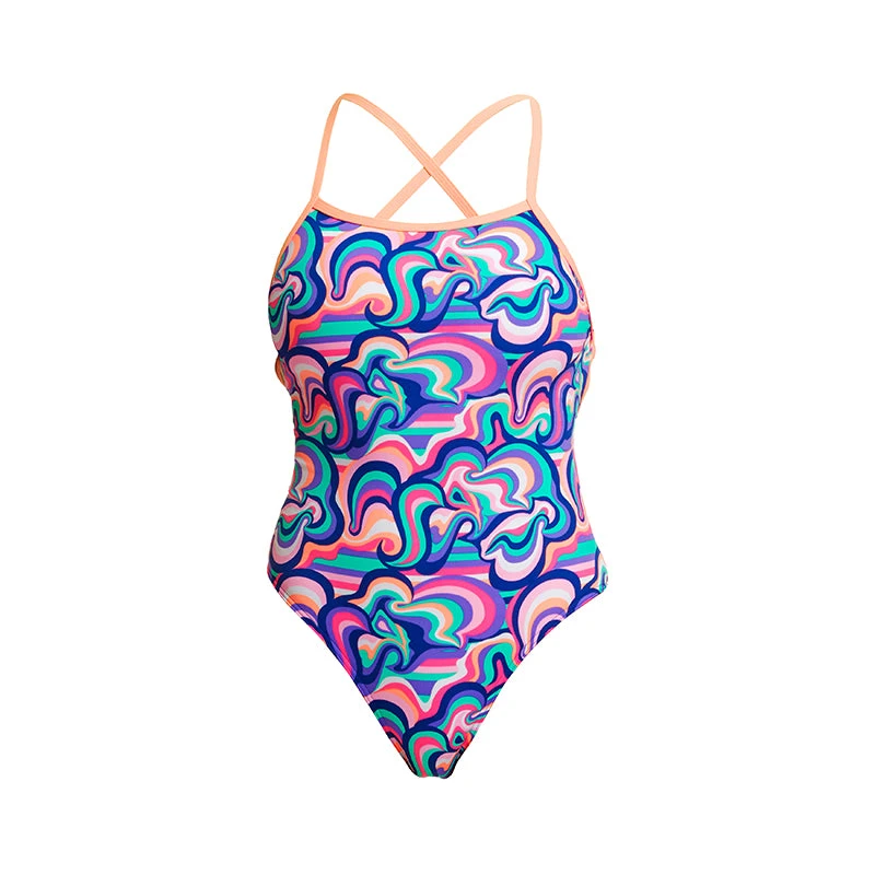 You’ll be sure to get noticed on pool deck in our strappiest one piece yet! Single strap binds that criss cross down your back with a moderately high cut leg and full front lining.