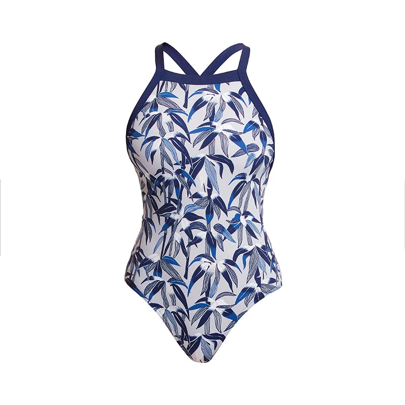 This streamlined suit features wide straps, a high neck and teardrop shaped back cut out. With adjustable straps and modest rear coverage it is perfect for lap sessions. Suitable up to a D cup.