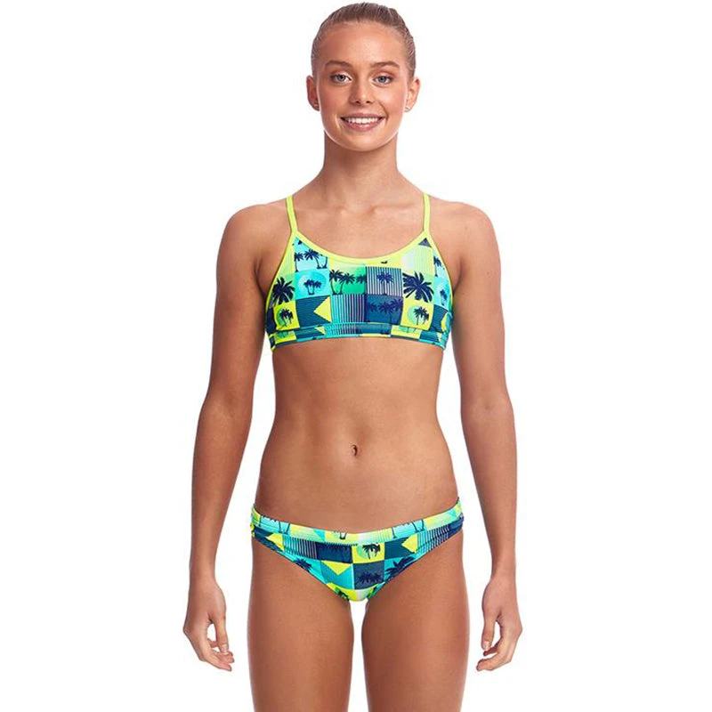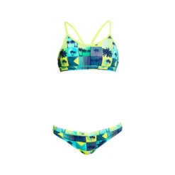 A firm fitting crop top and hipster brief suited to the sporty girl. Its a secure fit with underbust and waist elastic and drawcord in the brief. Features a single shoulder bind strap finish.