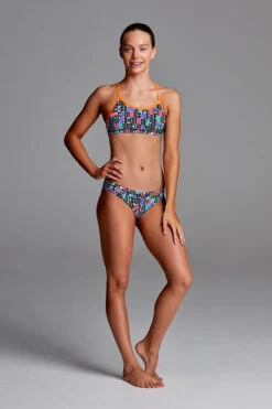 A firm fitting crop top and hipster brief suited to the sporty girl. It’s a secure fit with underbust and waist elastic and drawcord in the brief. Features a single shoulder bind strap finish.