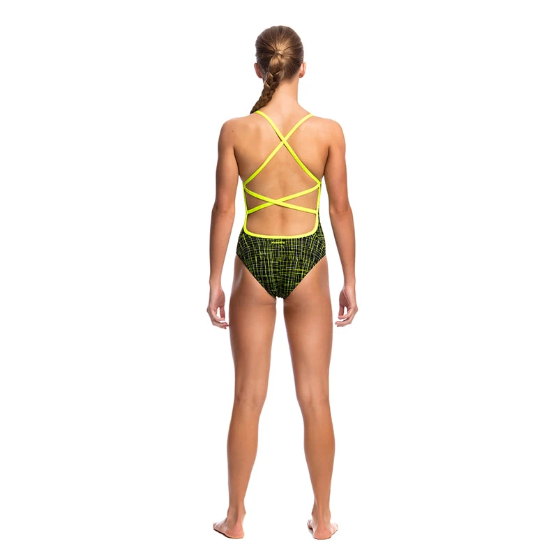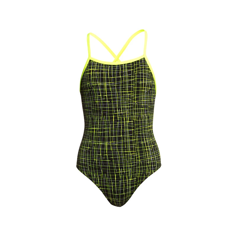 You’ll be sure to get noticed on pool deck in our strappiest one piece yet! Single strap binds that criss cross down your back with a moderately high cut leg.