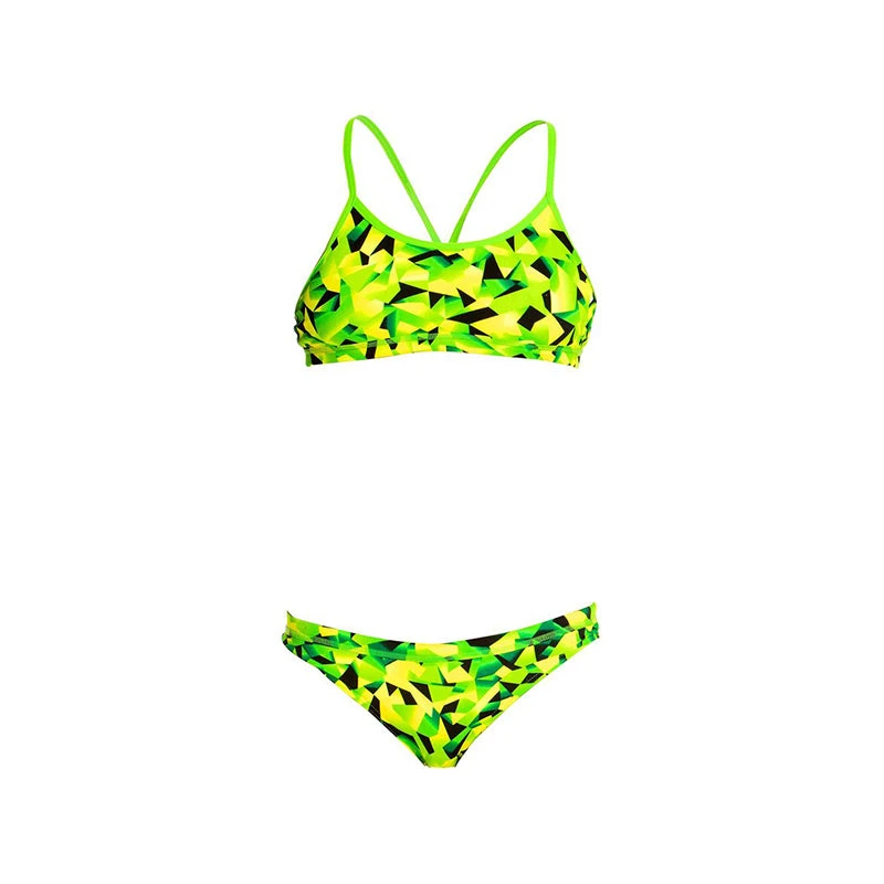 A firm fitting crop top and hipster brief suited to the sporty girl. It’s a secure fit with underbust and waist elastic and drawcord in the brief. Features a single shoulder bind strap finish.