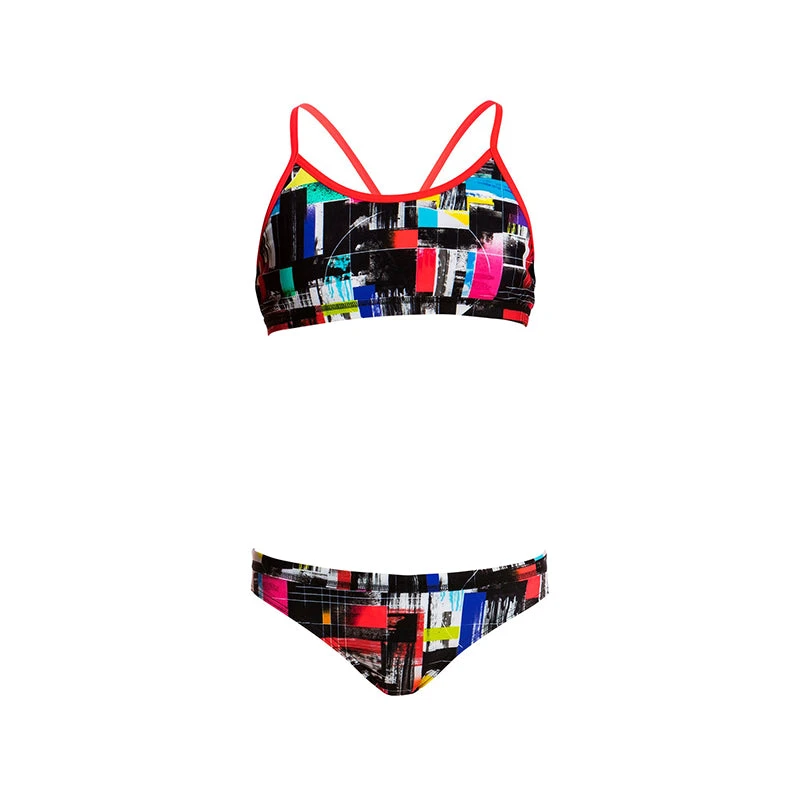 A firm fitting crop top and hipster brief suited to the sporty girl. It’s a secure fit with underbust and waist elastic and drawcord in the brief. Features a single shoulder bind strap finish. Available in sizes 8 – 14.