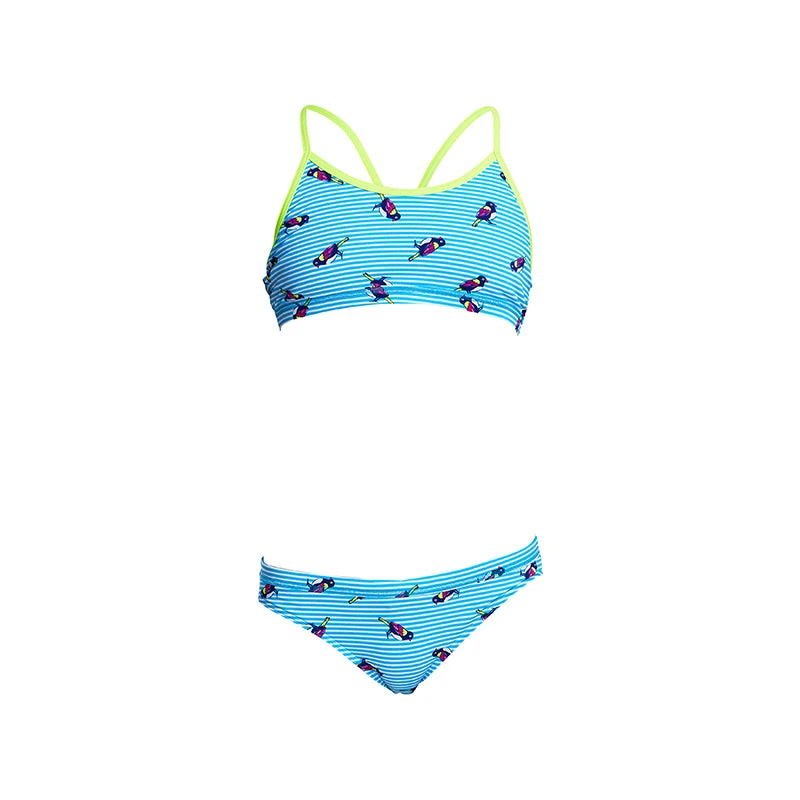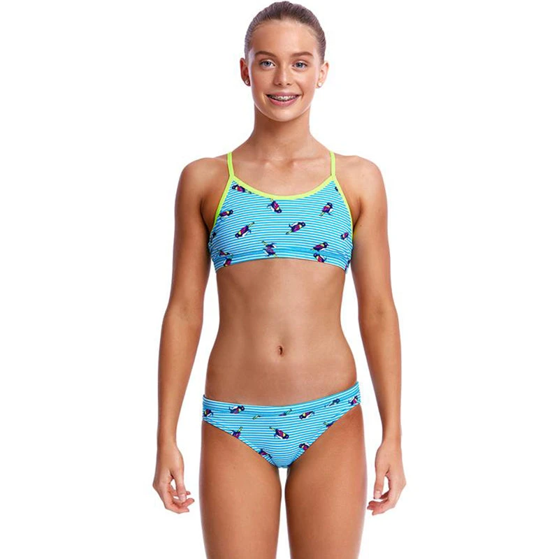 A firm fitting crop top and hipster brief suited to the sporty girl. It’s a secure fit with underbust and waist elastic and drawcord in the brief. Features a single shoulder bind strap finish.