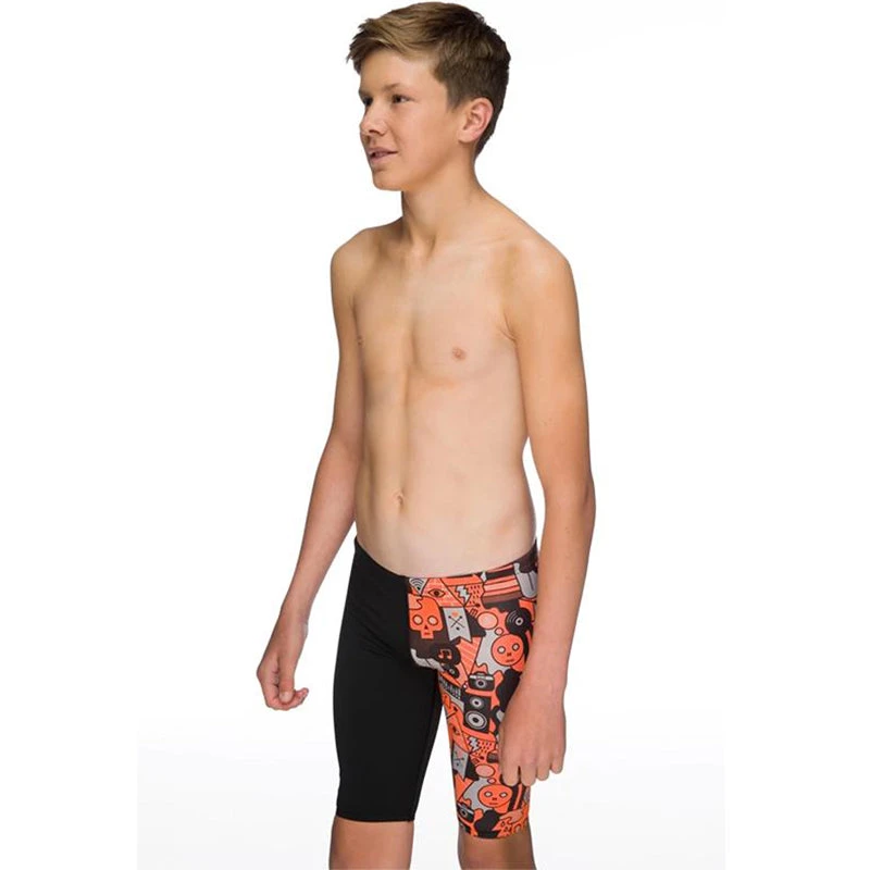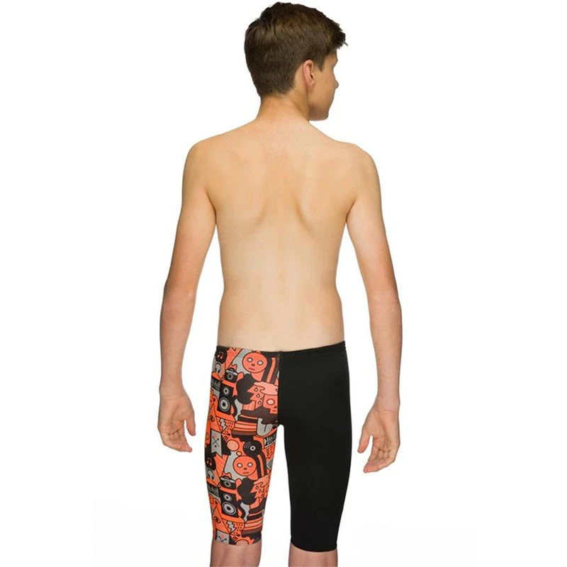 The Maru Lookout Boys Pacer Jammers feature a solid black right leg and an orange, grey and black music inspired patterned left leg. These jammers offer comfortable leg openings, are quick drying and hold their shape. Active swimmers will enjoy the all-around comfort of these jammers.
