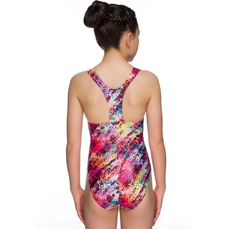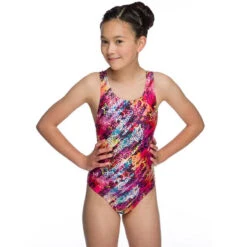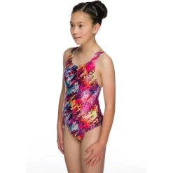 A bright pink girls swim suit with a sparkley print . Designed with an apollo back ,for unrestricted shoulder movement, but a closed and supported mid and lower back.Swin suit is eye catching as has pink sparkle detailing on the front.