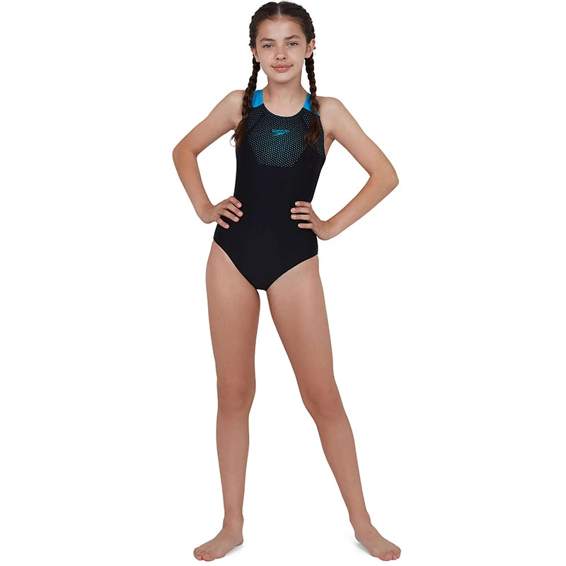 This sporty Muscleback is a Speedo favourite, featuring thick straps, positioned to free up the shoulder blades, ensuring a comfortable fit. A medium cut leg offers for just the right amount of coverage, ideal for regular swim sessions. Soft and stretchy, our Endurance10 fabric will ensure kids can swim in comfort, whilst Creora HighClo means their suit will fit them like new for longer. (808324D812)