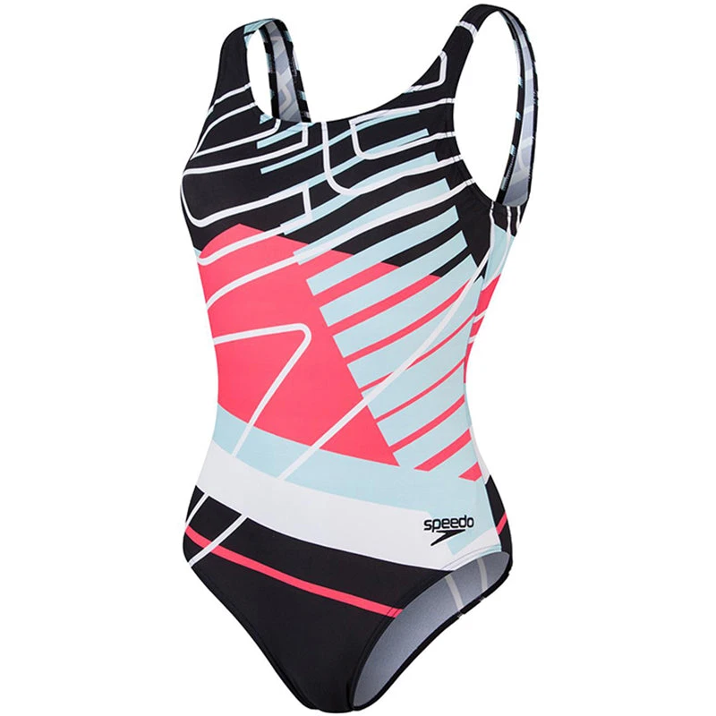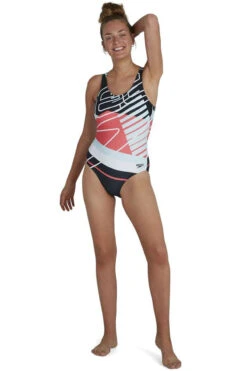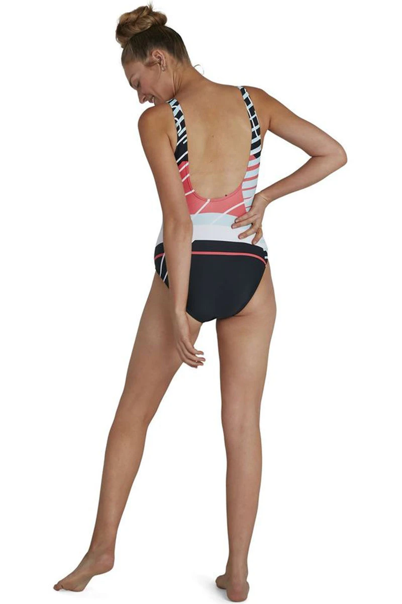 Bold branding, racing stripes and colour blocking – welcome to the 90s, reworked. Fashion is having a 90s sportswear revival, so bring your A-game to the beach and pool with this retro-style navy swimsuit featuring a bold lightning-style motif and a medium cut leg. The U back and scooped neckline offer style and flexibility while our shape-retaining Endurance10 fabric ensures your suit fits like new for longer. (807336F376)